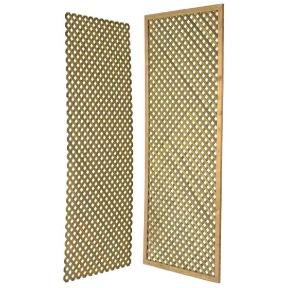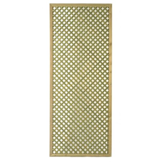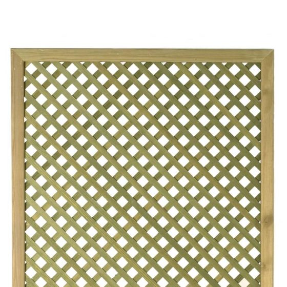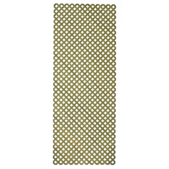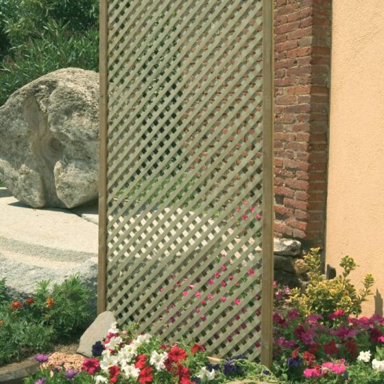 Celosía realizada en madera tratada en autoclave cuyo entramado dibuja rombos. Las celosías se utilizan para delimitar, proteger, decorar y aislar todo tipo de espacios. Dejan entrar la luz y el aire, impiden ser visto pero permiten ver. También ofrecen soporte para plantas trepadoras y tapizantes.