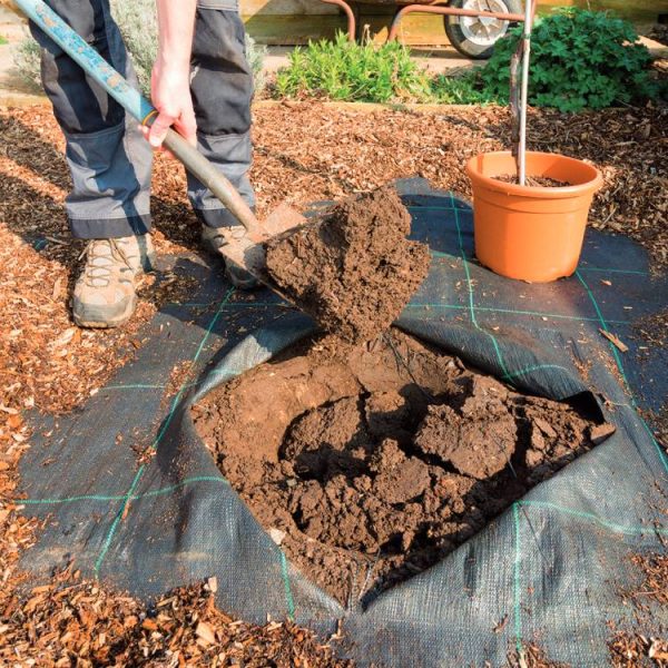 Para un control eficaz y estético, la malla se cubre comúnmente con grava o corteza. Esto mejora la apariencia y al mismo tiempo asegura que las hierbas no puedan atravesarla.