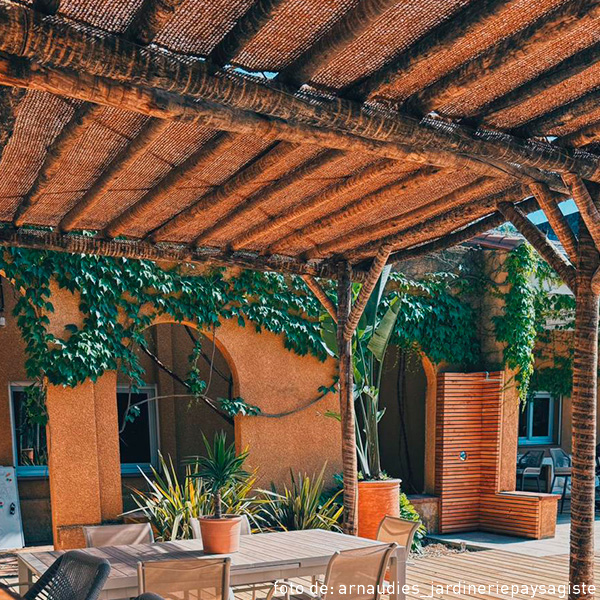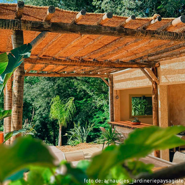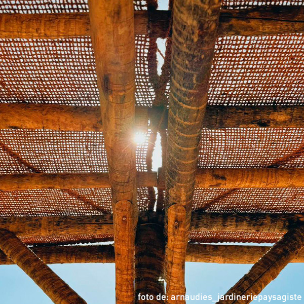 La pérgola de eucalipto está fabricada con un material rústico que presenta imperfecciones características de la madera natural. Cada poste se pela manualmente o con máquina según su diámetro. Son mantenidos deliberadamente en su estado bruto, sin ser cepillados, para conservar un aspecto natural y único. El eucalipto es una madera de densidad moderada, que varía entre 700 y 800 kg/m3 según el grado de humedad.